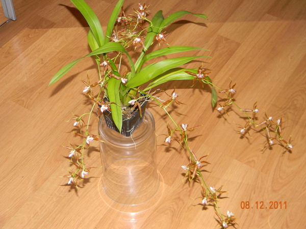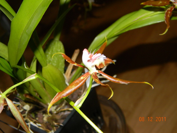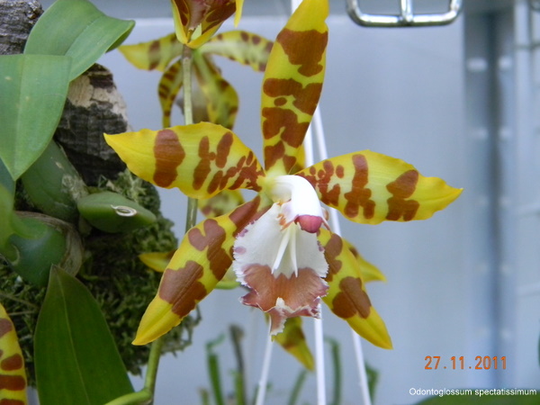Rozkvetlo Odontoglossum sceptrum dvěma stvoly celkem s 21 květy. Největší květ má rozměry 5 x 6 cm. Na klacku se mu celkem daří, ani menší přísušek mu neuškodí. Zjišťuju, že tyhle ekvádorský odontoglosa nejsou až tak háklivý, jak se o nich míní. V pohodě snášejí vysychání i sluníčko. Musí si na to ovšem zvyknout.