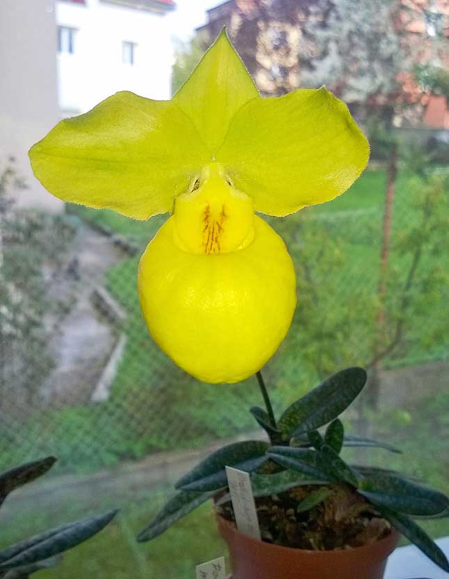 Tak už krásně kvete to P. armeniacum. Ten střevíc je obrovský oproti poměrně malé rostlině. Na okně spolu s P. venustum je to dvojka k pohledání