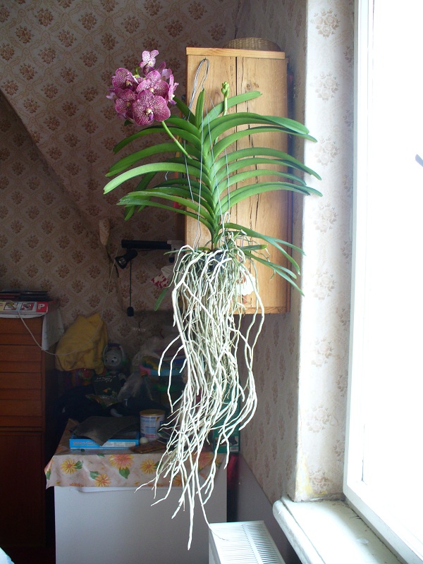 10vekikych kvetu a bohuzel ulomena 2 poupatka odshora-10cm na prvnim vyhon ua druhy je takova ta klasicka palicka nahore.Pan tvrdil,ze je to Vanda Red Magic-ale me cervene ma daleko-spis takova vinova.Ptala jsem se prodejce na rodice,jesli nema Vandu sanderianu a spot-a on ze ze proste je to V.Red magic.Meli tam jeste velikostne a kvalitove tutez jen tmave fialovou taky se dvema vyhony-po te jsem pasla ihned,ale vzala jsem si tuhle,protoze me pan ukecal,ze tahle ma druhy vyhon mensi a nez mi pokvete,tak mi odkvete ten druhy a vic si ji uziju.U jednoho stanku melu nadhernou site cervenou za 35 eur,ale koreny nic moc a nahore uz zadne poupe.