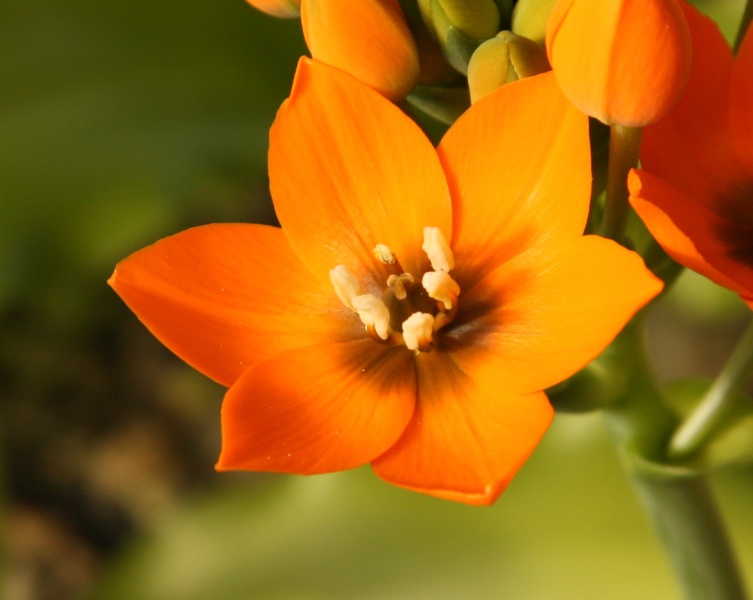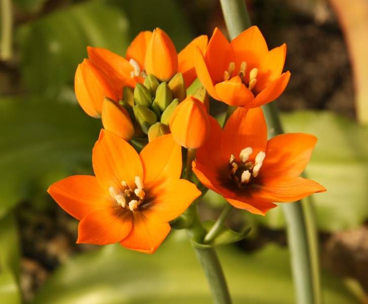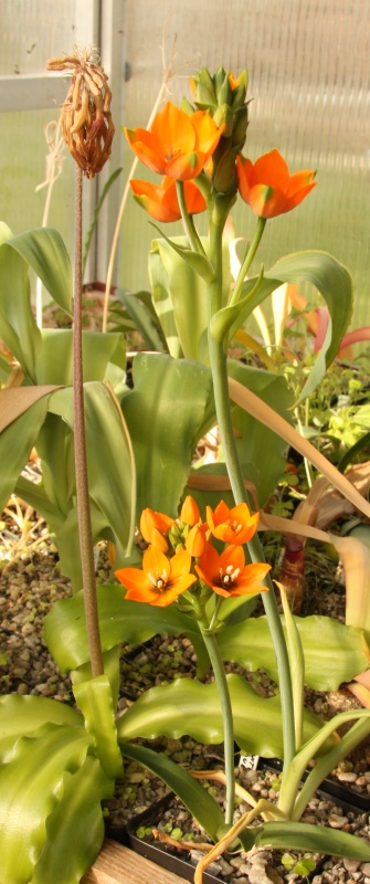 Přikládám slíbené obrázky Ornithogallum... no, dubium to asi nebude. Tenhle jihoafrický druh se vyskytuje v přírodě v bílé, žluté a oranžové formě. Zvláště ta poslední zaujala holandské pěstitele a tak každoročně sekají milionové série hrnkovaných nakvetlých jedinců, jsou prostě všude. Ovšem kytka (možná jen ta holandská selekce/hybrid - nebo co to je) je zakletá - druhým rokem už cibule většinou nevyraší; zůstane sice několik let živá, ale růst se jí nechce. Na tom se shodují pěstitelé po celém světě. Já jsem si postupně koupil dvě takové kytky (druhou proto, že ta první nerostla