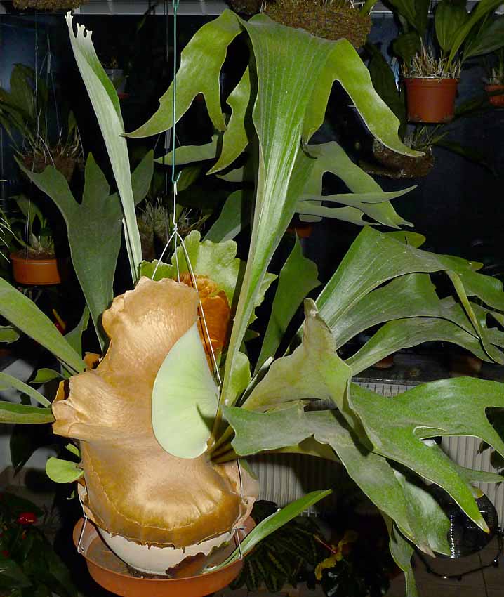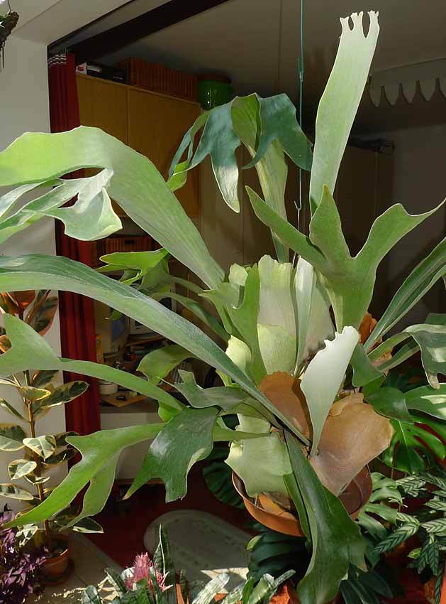Košíky i Platycerium bifurcatum jsem vyfotil. To platycerko přerůstá a tak jsem mu postupně hodně listů ostříhal. Dělá stále nové a nové výhony. Dokonce roste i odtokovým otvorem v květináči. Je to šílený plevel, ale pohledný :P