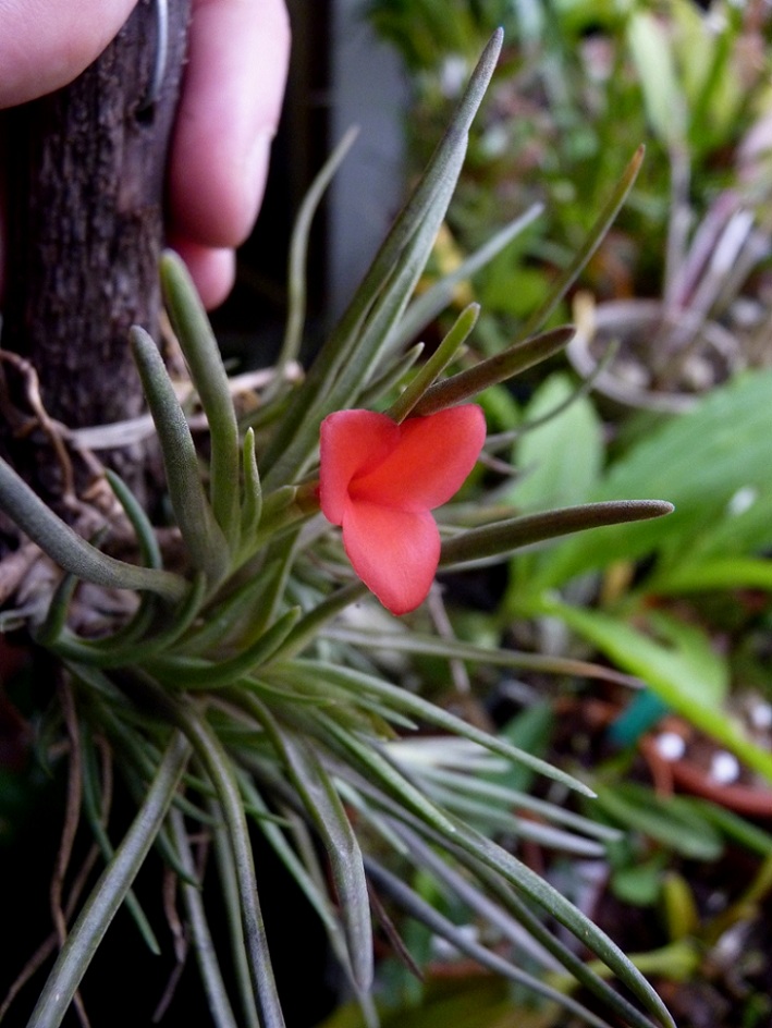 Mně právě kvete květem velice atraktivní Tillandsia albertiana. Jen ten květ je na živo víc červený než udělá fotoaparát. Dalo by se to upravit v programu, ale bylo by to moc znát.