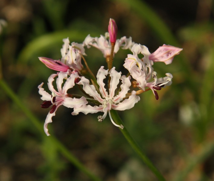 Tak zase něco kvete. První je Nerine masoniorum z čeledi amarylkovitých; je drobounká, s květy o průměru do 2 cm a tenkými, na průřezu oválnými listy. Patří do větší skupiny "letních" až stálezelených nerine, kam patří také daleko známější Nerine bowdenii (její řezaná květenství se občas objevují v květinářství). Zvláštností nerin je, že semena zrají velmi rychle, během pár týdnů, a dají se úspěšně vypěstovat i na tom řezaném květenství; kytky jsou většinou samosprašné. Po výsevu to ale do květu pár let trvá :) .