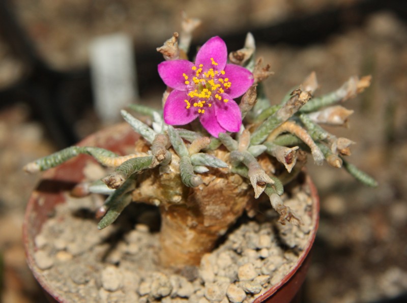 Třetí a pro dnešek poslední je Avonia quinaria ssp. quinaria z čeledi šruchovitých - není to cibulovina, vytváří tzv. kaudex. Taky se ji teprve učím. Kvítky jsou asi půldruhého centimetru široké a otvírají se odpoledne, večer zvadnou. Kytka je cizosprašná, mám dva kusy a květy se krásně střídají, takže se mi nepovedlo opylení. Asi si budu muset dát nějaký pyl do lednice.