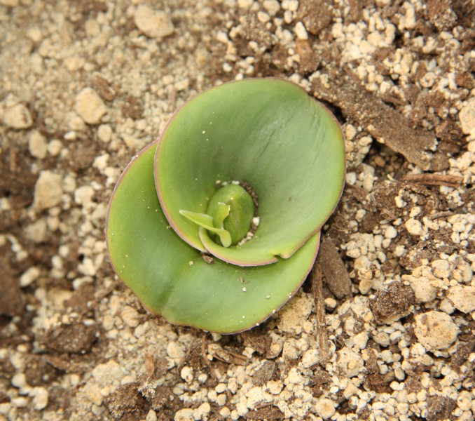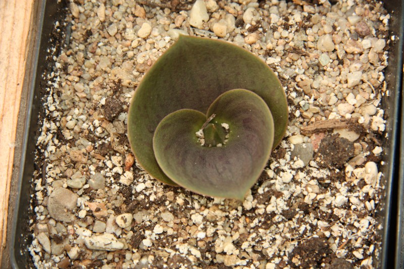 Massonia depressa je asi nejobyčejnější z masonií. V podzemí je cibule velká asi jako vlašský ořech, ze které na podzim vyrostou dva široké, masité, k substrátu přitisknuté listy (takhle rostou všechny masonie); u většiny forem jsou hladké, občas se vyskytnou jedinci s listy pokrytými bradavičkami. Tady na fotkách ve stadiu rašení. Uprostřed mezi listy je květenství, v tuhle chvíli ještě kryté listeny.