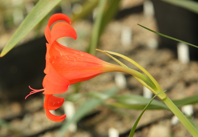 Letní jihoafrické cibule naopak končí vegetaci a začínají kvést, tady Cyrtanthus sanguineus. Květ má průměr asi 10 cm.