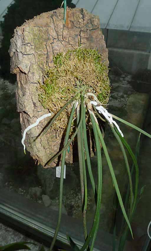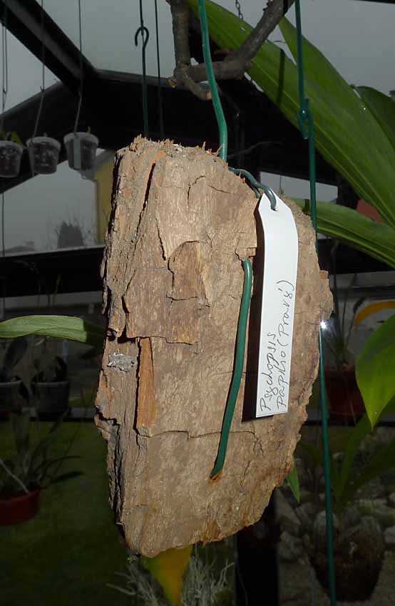 . Kůra pak má sklon k obloze, čímž je na tom rostlinka lépe z hlediska světla a také při rosení voda tak rychle nesteče. Kůry jsou provrtané a jmenovky na háčcích. Takhle jsem si to pro sebe vymyslel. Moje produktivita je asi tři kůry s kytkou za hodinu