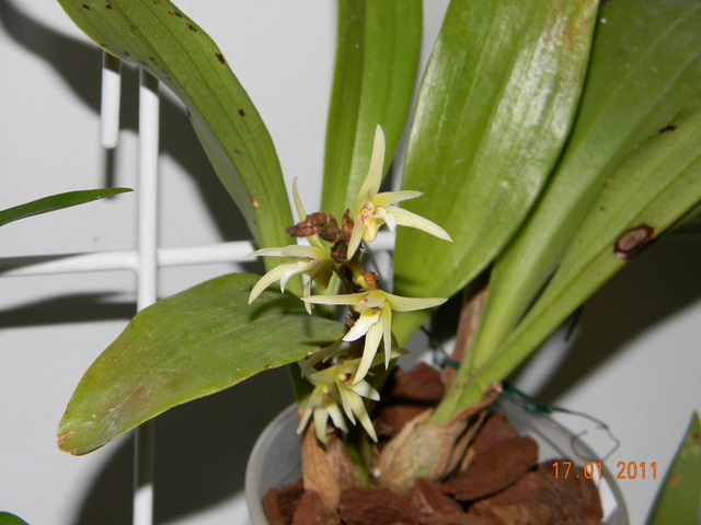 Kajmi: Měla jsem ji na parapetu, květní stvol se objevil koncem listopadu. Šlo to pomalu. Od vánoc mám vitrínu, dala jsem ji tam kvůli světlu a jde to trochu rychleji. Ty květy by měly mít okolo 2 cm. Na okně jsem měla pocit, že by do té velikosti ani nedorostly. Je pořád málo světla.