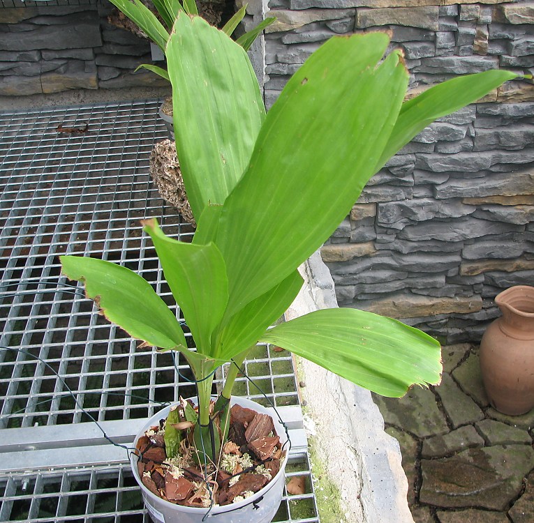 Této Anguloi dávám jen hrubší substrát. Je to velká rostlina, květináč je tím pádem větší, substrátu je hodně. Jemný substrát drží víc vodu, hrozilo by při delším vysychání zahnití. Nemá zvlášť požadavky na substrát. Je ochotna kořenit do hrubšího i jemnějšího substrátu. Řídím se tedy jen optimalizací doby vysychání.