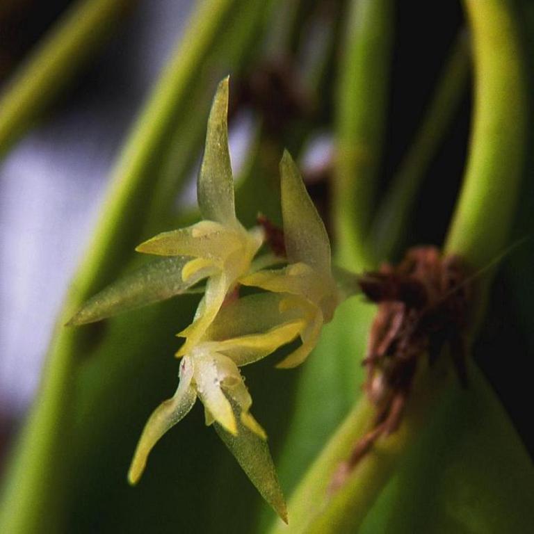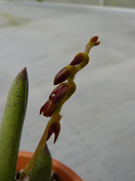Nakvétá Pleurothallis obovata. Květ má na výšku asi 4mm, tak proto je ta fotka tak špatná. Je to výřez z většího záběru. I když má můj fotoaparát makro od jednoho cm, na tohle prostě nestačí.
