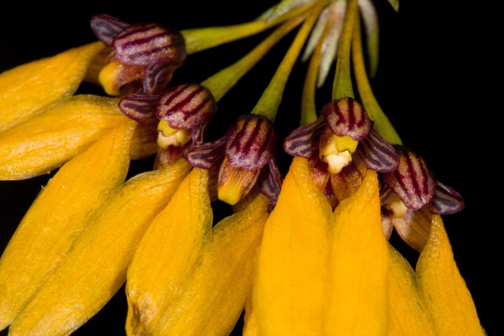 Bulb. retusiusculum var. tigridum. Drobné bulbophyllum dobře rostoucí a kvetoucí. Někdy kvete z pahlízky i dvakrát.