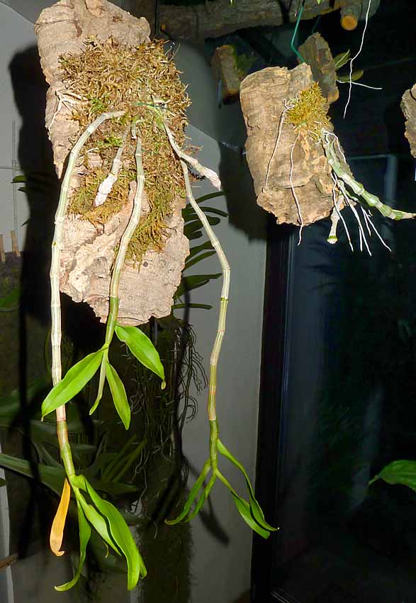 Nicméně, když bylo horko, tak jsem měl D. senile venku, takový světlý polostín. Nějak mi rostlo na dvě strany, tak jsem tu menši přidělal na plát borovicové kůry, větší zůstala na tom slinutém korku. Sušením se jaksi nezabývám, kytky začaly po přestěhování do skleníku vypouštět nové kořeny, tak nevím. Dávám jim vodu.
