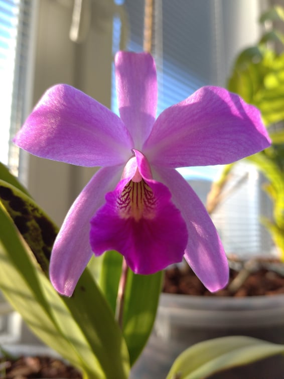 Dovolím si ještě přiložit fotku kvetoucí Laelia gouldiana. Za ní je list a na něm velké černé fleky ještě od původního majitele. Nejspíše také houbová choroba nebo snad zčernání po ožeru hmyzem.