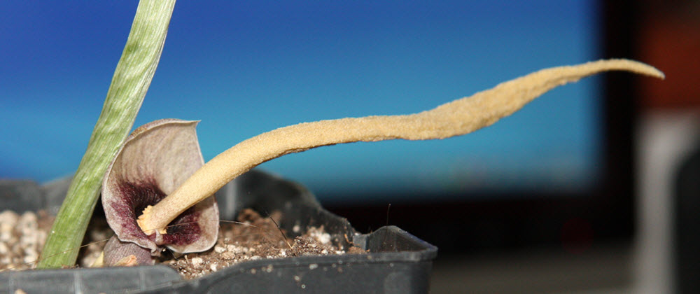 A. polyanthus - spadix je asi 12 cm dlouhý, toulec má v průměru asi 2 cm. Je vidět i řapík právě uvadajícího listu. Na posledním snímku rozdvojující se hlíza