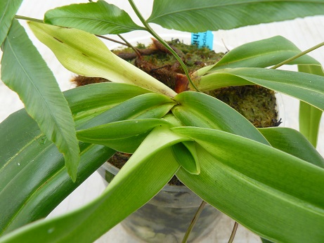 Dostal jsem rostlinu vloni od Ježíška :D . Měla kořeny v dost mizerném stavu, tak jsem ji ihned přesadil. Za tu dobu co ji mám celkem slušně zakořenila. Horší to bylo s růstem listů. Zdá se mi, že jí vůbec neprospěla ta letošní vedra i když to mohlo být i v důsledku špatných kořenů. Druhá růžice zřejmě vyslepla a začala vyhánět třetí. Od té doby, co se ochladilo, je růst podstatně lepší. Po celou dobu jsem ji pěstoval doma na parapetu, ale celá rostlina se začala silně naklánět ke světlu. Navíc se mi zdá, že je na ni doma moc teplo. Teď je v chladu a stínu na podlaze skleníku, tak čekám co udělá. Na květy si zřejmě ještě nějaký čas počkám :?