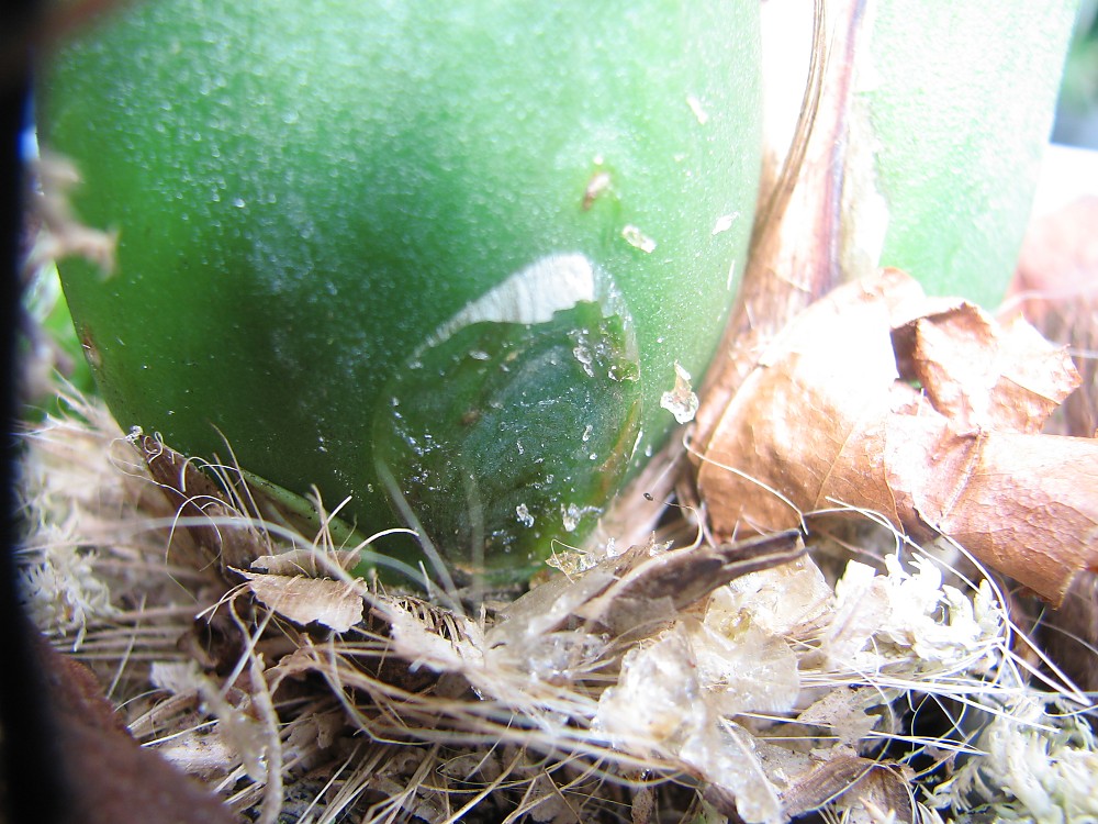 No a ted koukni na tu moji.Listy má ,je furt stejná od července 2012 nic nenarostlo jen ten malý rosol-po odstranění už nic neteklo.Rosím substrát jen málo ,nedávno jsem ji lehce zalila, když trochu scvrkly pahlízky,který se pak vypnuly.Tuhle kytku tvoji(posílám foto ) máš z ledna.V této části růstu dál poroste nový výhon a i květní stvol?Jak ta kytka vypadá dnes.DĚKUJU-nějak se v tom nemůžu zorientovat.Také by mě zajímalo jak je to u apolenky.