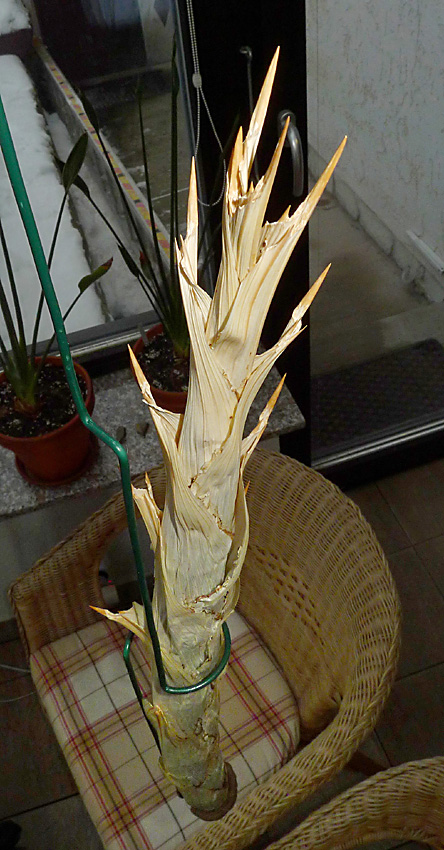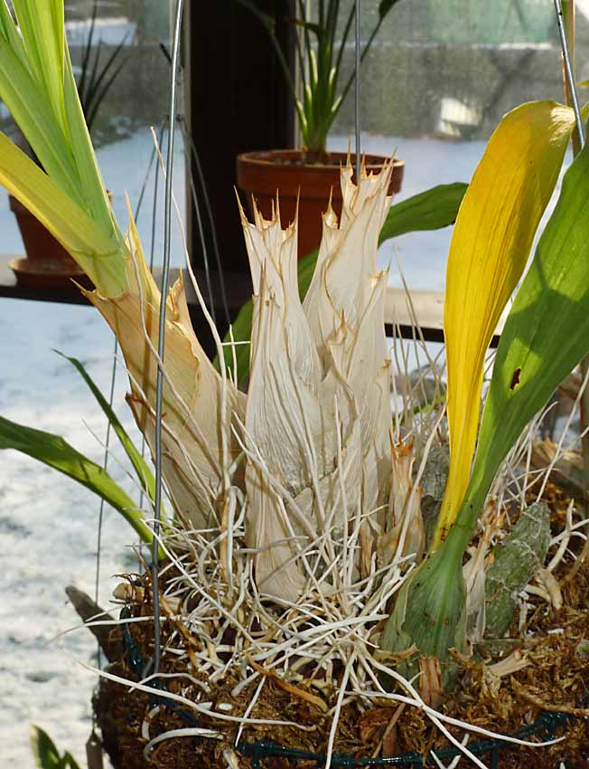 Nyní již Cyrtopodia shazují listy. V bezlistém stavu zaberou alespoň méně místa. Dva měsíce je již suším a vodu nedostanou do doby než nasadí na květ. Tato rostlina je původem od Tuly ze státu Tamaulipas Mexiko. Ještě nekvetla tak doufám, že se na jaře ukáže. Už je to docela macek