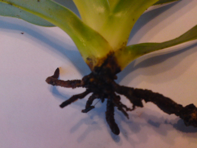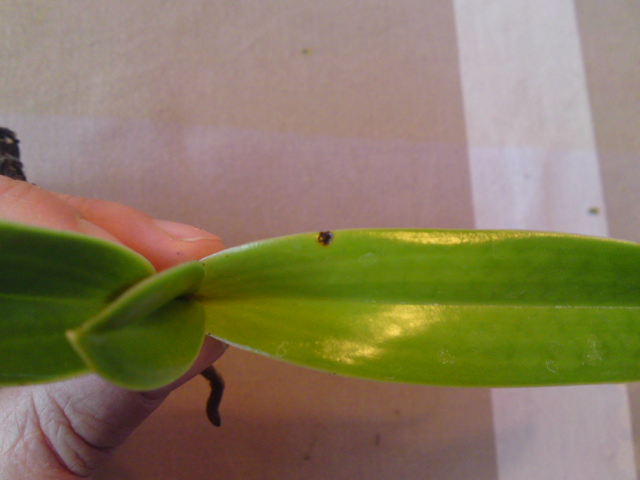 POMOC!!! V sobotu jsem na výstavě pořídila Paph.sanderianum a dnes jsem našla na listu hnědou tečku. Ač nerada začala jsem vysypávat substrát - vrchní nová kůra efektně zakrývala napadený krček. No a kořeny skoro žádné. Přikládám foto. Je to houba nebo bakterioza? Co bych měla nasadit?