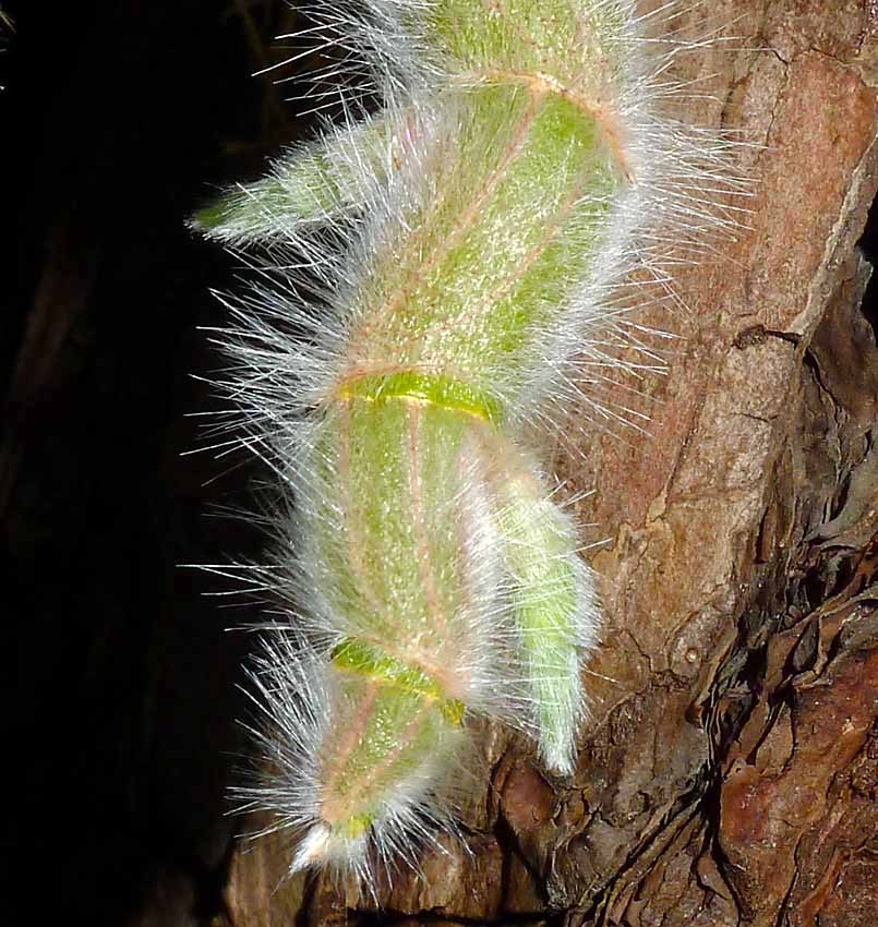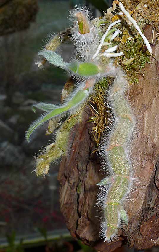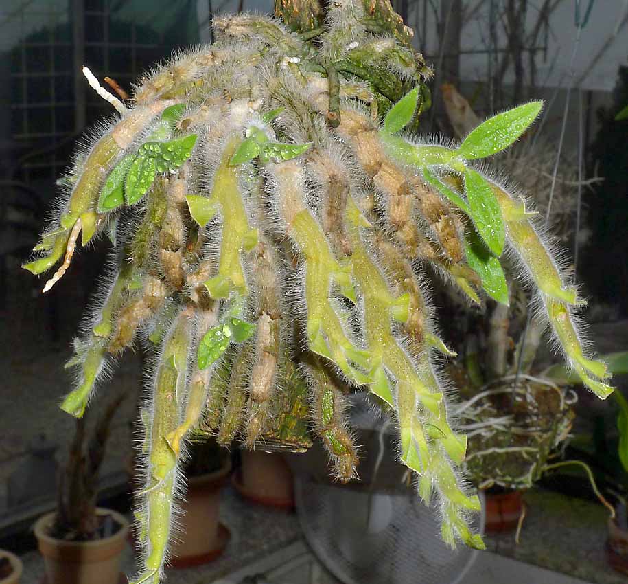 Je mi divné že ta rostlina z Drážďan ale nasadila. To veliké mám přilepené na větvi Bezu černého jehož kůra je nasákavá. Možná změnu hnojení ta rostlina ještě dostatečně nezaregistrovala. Před tím jsem hnojil více dusíkem (15-5-30) a v té kůře to mohlo ještě přetrvávat i během minulé sezony takže obrat nastává ve skutečnosti pomaleji než bych si přál. V něčem takovém vidím spíše zradu. Každopádně přidání KH2PO4 do zálivky ničemu ublížit snad nemůže. Většinou kvete tento druh na jaře, ale píše se, že i v létě. Násada na květ by mne určitě mile překvapila, ale spíše s ní nepočítám. Příští rok snad budu mít více štěstí.