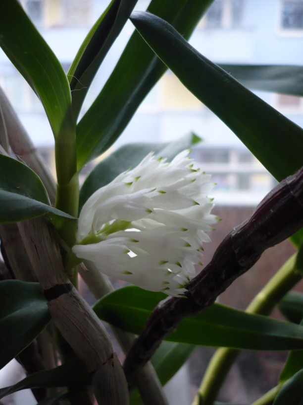 Dendrobium purpureum alba. Kvete mi už podruhé, letos má 4 květenství, což proti loňskému 1 považuju za úspěch. Nepotřebuje pokles teplot ani nižší zálivku a stačí mu celkem málo světla proti jiným dendrům