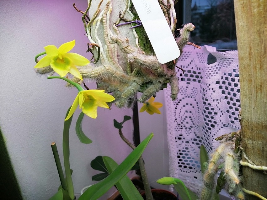 Nyní je po 3 měsících úplného sucha a je stále napitější než to vizirovo. V únoru až mi půjde slunce do ZZ tak se teploty zvednou a také střídání a pak myslím opadají loňské pahlízy a nasadí k intenzivnějšímu kvetení :) . Vykvést by pak mohlo na konci května jako D. anosmum, parishii, unicum. Trochu mi do toho nepasuje to rašení, ale i ty předešlé druhy když kvetou tak mají částečně narostlé nové výhony. No uvidíme.