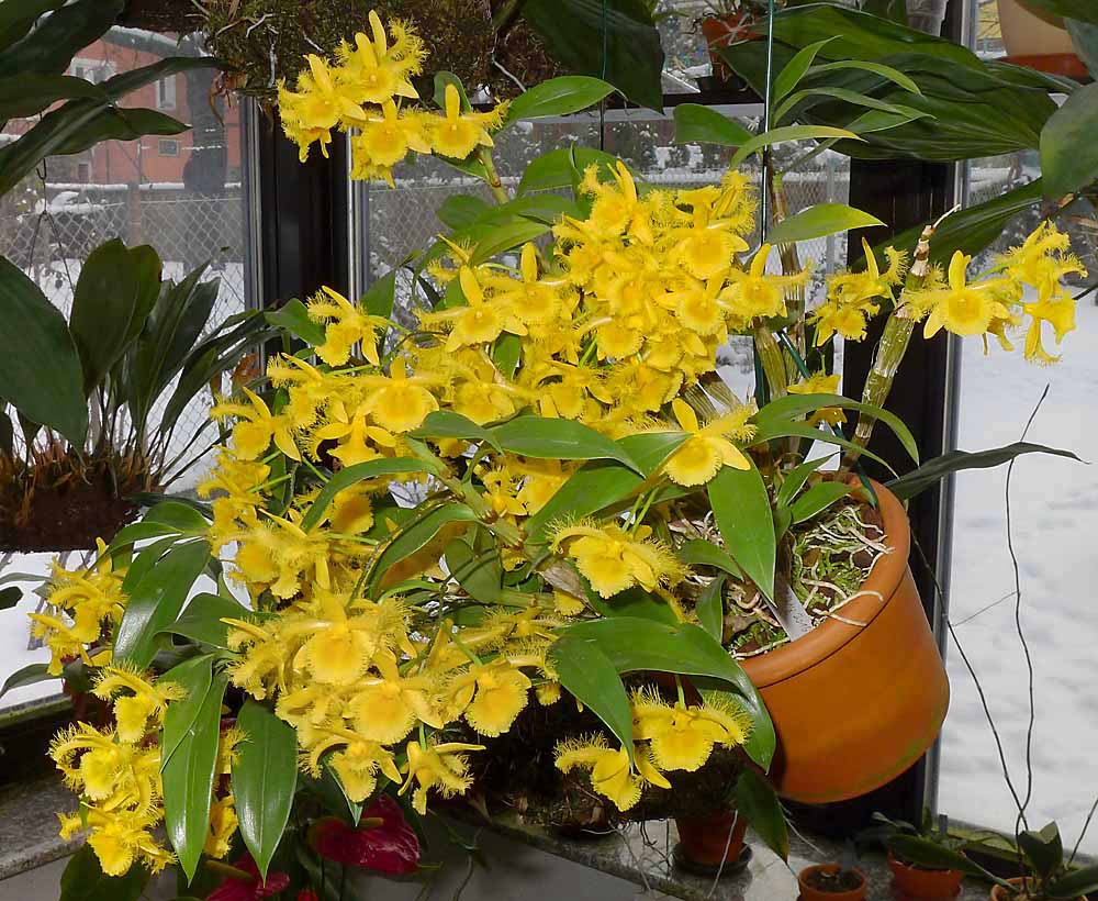 Phalaenopsis schilleriana v plném květu. Spolu s Dendrobium harveyanum docela hezký kontrast.