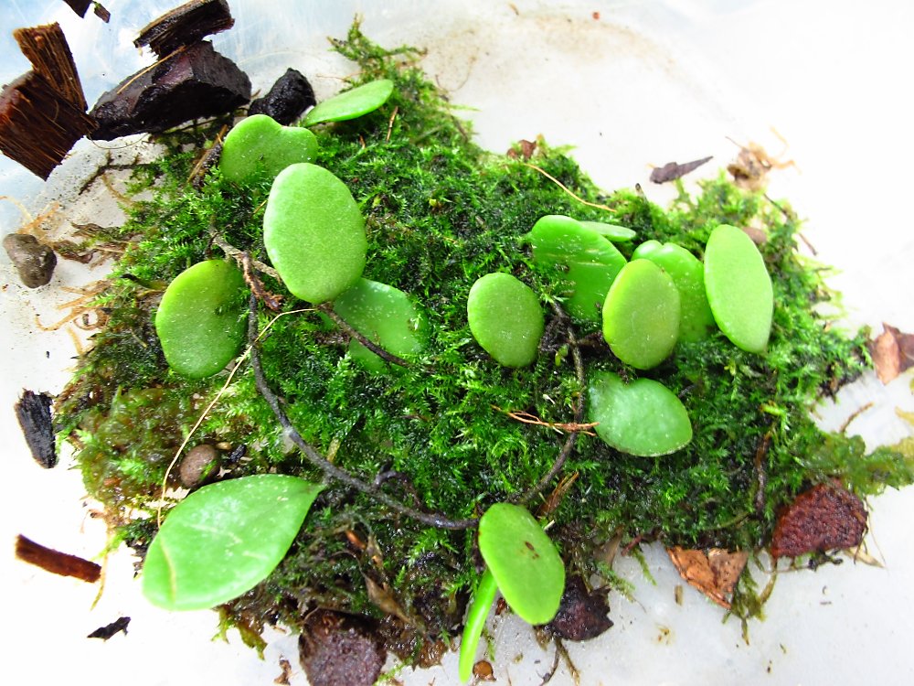 Poprosím také o určení.Jsou to 1cm tuhý lístky .Málem mě umřela když jsem ji měla navázanou.V botanický zahradě rostla jako převis na tenkých jakoby černých provázcích a byla krásná.Už se vzpamatovala lístky se napily -ale zatím neroste.