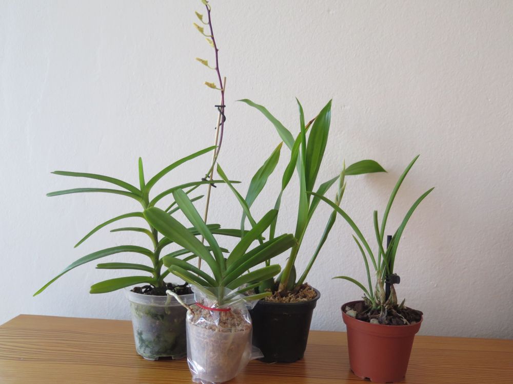 renanthera citrina nakvetlá, aerides flabellata, coelogyne nitida s poupětem a laelia lundii.