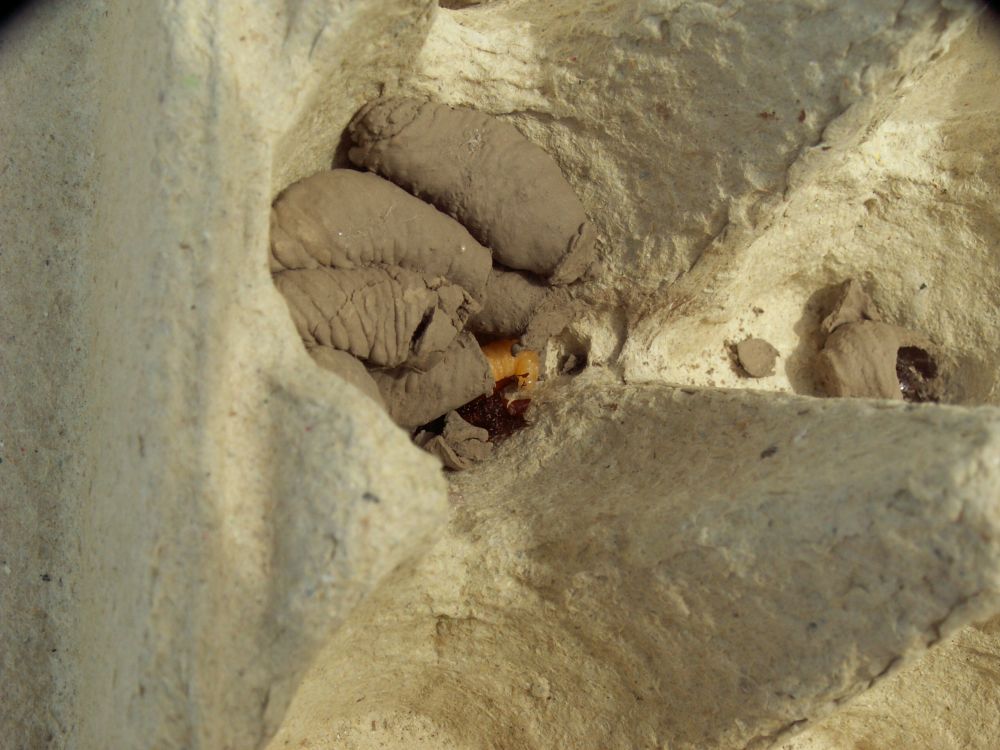 Zkoušel jsem hledat na webu, ale nějak se mi nedařilo. Toto- viz foto, jsem našel v šopě v papírovém zásobníku na vejce. Jsou to jakési hliněné skořápky a vevnitř taková žlutooranžová larva. Prasklo to, když jsem to doloval.
