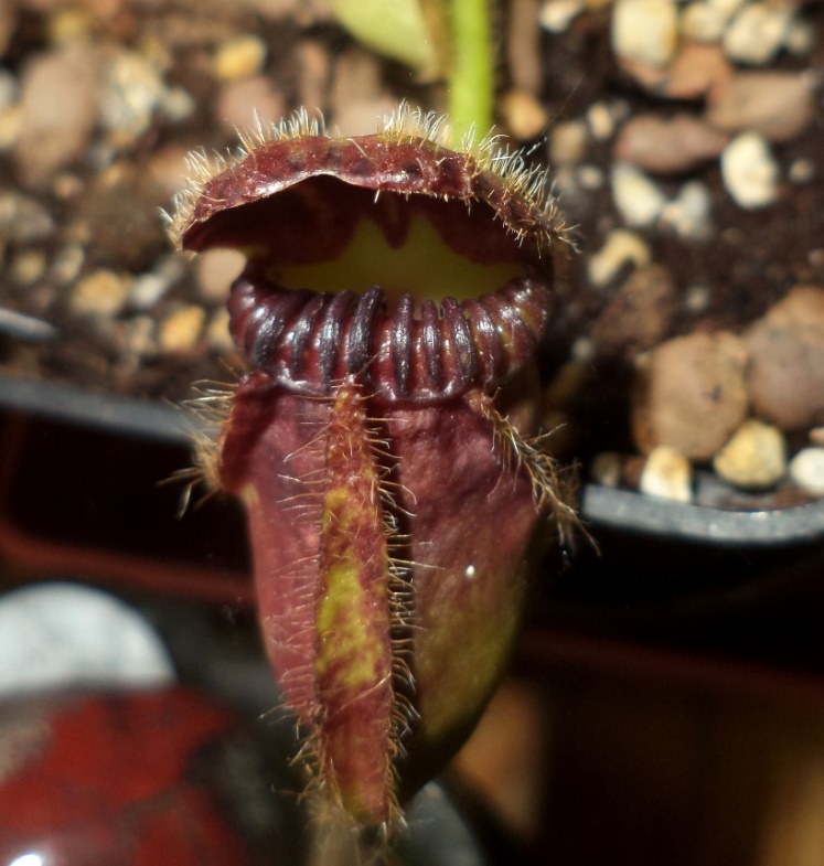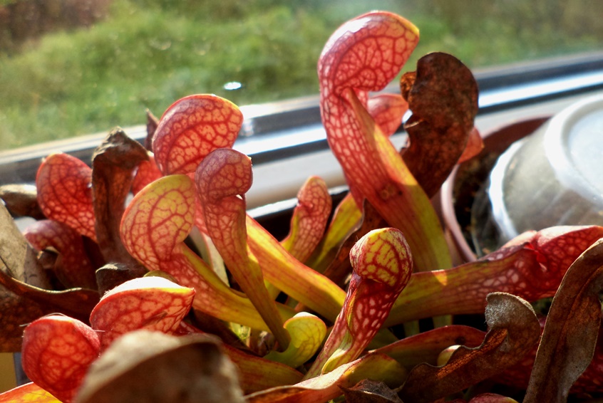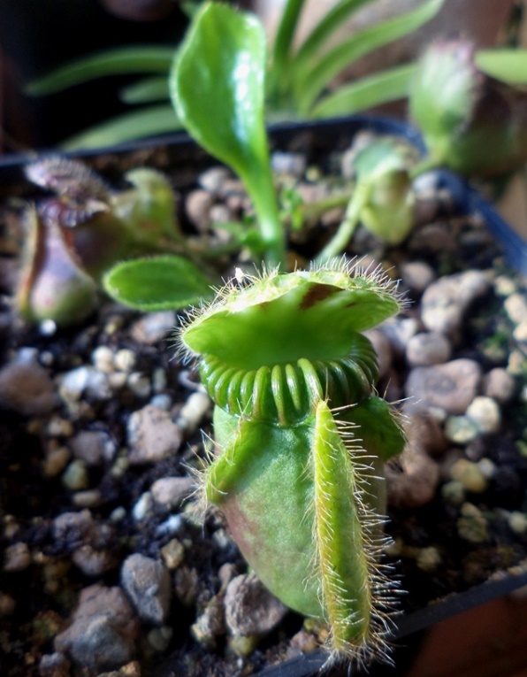 Cephalotus - zhoršující se světelné podmínky - starší pastičky z léta vypadají ještě pěkně.... nové vyrůstají už jen slabé...zelenější a začíná tvořit listy...