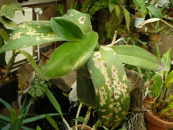 Přikládám foto Laelie purpurata.... myslím si, že jde o nějakou hnilobu - vzhledem k tomu, že jsem zjistila, že je to i na krčku pahlízy.... květy měla v pořádku, ty fleky jsou ale nehezký a jak je teď venku, tak to nějak více vyniklo.... Co si o tom myslíte?