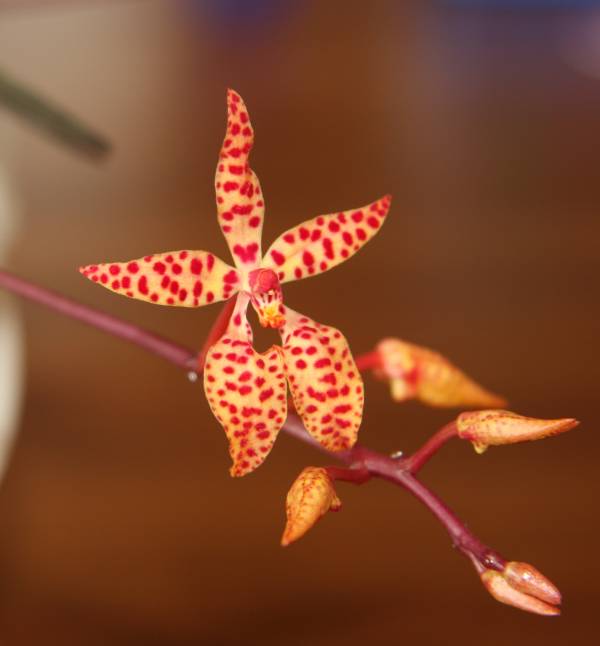 Už kvete celý stvol, celkem šest květů. Druhý stvol se dotýkal studeného okenního skla a špička odešla.