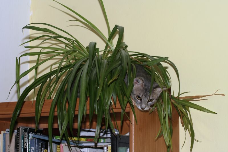 Tohle je pro kočku ideální spojení - výška a rostlina. My jsme vršek pokojové stěny vyčlenili pro kočičí použití. Odnaučit je devastovat kytky chvíli trvá, ale jde to pomocí rozprašovače s čistou vodou. Na jedné straně kocourovi něco přísně zakážu, ale na druhé mu vyhovím. Na skříně má udělaný i přístup, aby je neničil šplháním. Kytky už neničí.