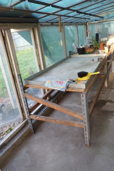 Stoly jsem ponížili, je to znát a tím se zvýšil prostor na navázané rostliny....a dobře se na něm bude pracovat. Byl to skleník jen na pelargonie a v zimě těch 14 st je na ně moc, tak jsem to rozdělili v jednom(zadním) budou pelargonie- teplota cca 8-10 st i méně....a v předním budou orchideje teplota 12-14 st....víc tam nepustím....vše se ukáže až tam nastěhuji co potřebuji.....Věra