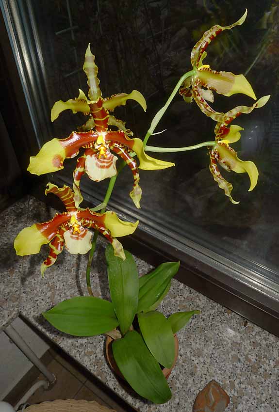 Nyní mi rozkvetlo Odontoglossum grande z jiného zdroje než to předchozí. Je to taková robusnější rostlina s delším květním stvolem a více probarveným pyskem.