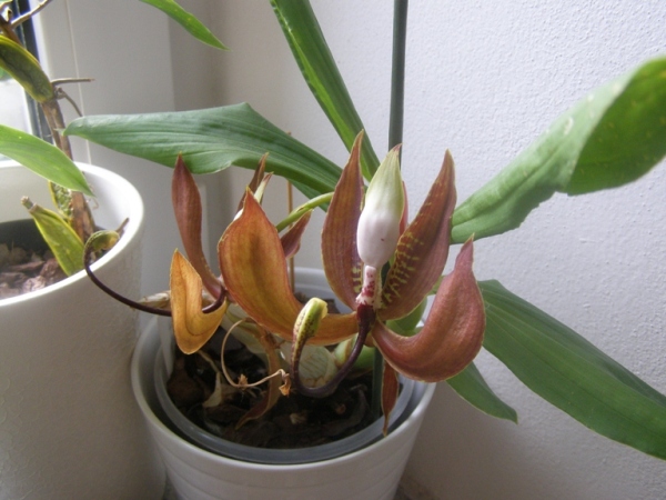 Rostlina je veliká 20cm, ale je to její první kvetení, takže určitě ještě povyroste ;) . Květ je velký 4 x 3cm, ale délka pysku s ostruhou je 5cm. Je to opravdu mimořádně zajímavý květ. A navíc voní po kávě! Takovou vůni jsem u orchidejí ještě nikdy nečichal :? .