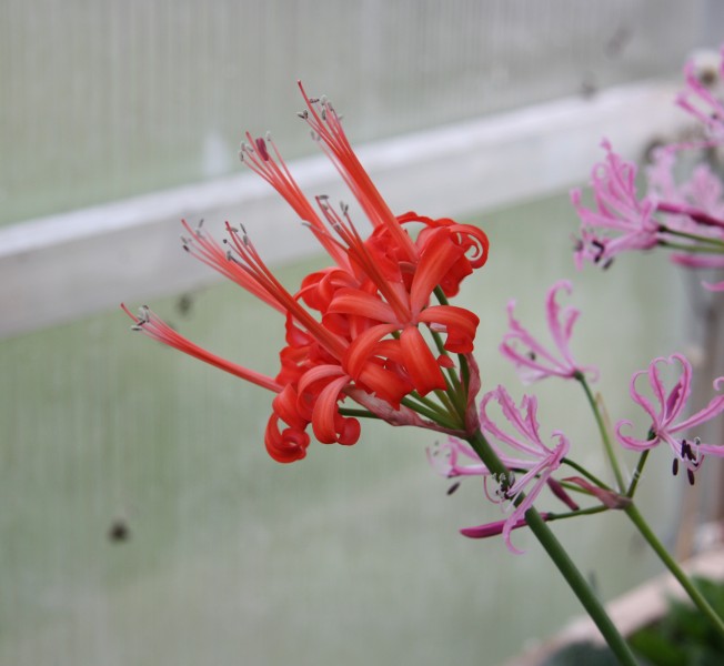 Pak je Polyxena longituba z příbuzenstva lachenálií; květy jsou malé, ale krásně voní. Na posledním obrázku z téhle série je Nerine sarniensis. Lámu ji ke kvetení už čtyři roky a teprve letos se povedlo; pokud někoho zajímá variační šíře těchle cibulovin, doporučuji tuhle stránku: http://www.nerines.com/. Tak, a jdu spát