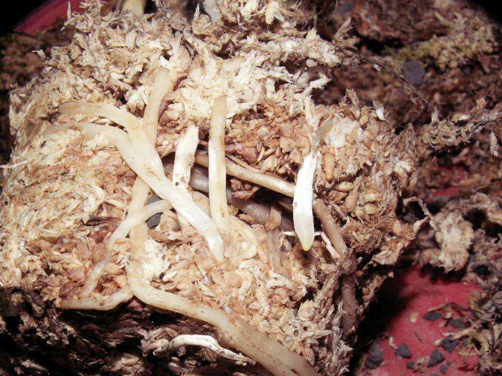 Kytka dorazila v pátek odpoledne, do skleníka jsem ji dostal až večer , takže podrobnější zkoumání jsem nechal až na denní světlo. Z dálky to vypadalo dobře, dva pěkné výhony, ale šedý šutr dával náznak co bude dál, rašeniník byl pod ním, kořeny na větším výhonu nefunkční, menší výhon se jeví vitálnější. Tak jsem to vytáhl z květináče viz foto, něktré kořeny byly živé, tak jsem to obral z přebytečného rašeliníku a zasypal piniovkou s dřevěným uhlím. Mám to ve skleníku, kde prozatím teplota klesá k 16. Píše se tu i o 12. Tak tolik to snese suché/ zalité ?