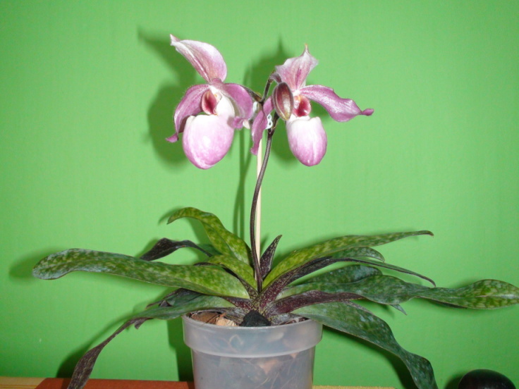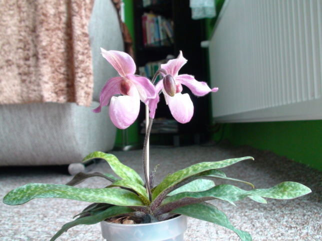 Paphiopedilum Dellaina a nějaký odonto...... hybrid,už ani nevím kdy a kde jsem k němu přišel,dávám sem foto protože letos vykvetl obzvláště velkými květy 13cm průměr.