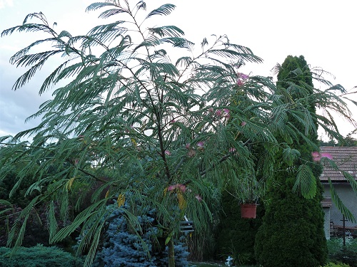 Jo nevšimla jsem si názvu , jsou nádherné..Míra píše:Je to pod obrázkem. Strom nebo keř(záleží jak se zapěstuje. Jde o perskou akácii z rodu mimózovitých. Na snímku je vidět, že ráno ještě spí, protože má zavřené listy, které zavírá navečer a cca okolo 7 hodiny ráno je otevírá a vypadají jako palmové listy. Květy nádherně voní. Dám foto, až bude více rozkvetlá. Dá se pěstovat i jako bonsai. Tento duh Albízia Julibrissin když je starší a vyzrálá ve dřevě snese i -20°C. Tři roky jsem ji přes zimu zakrýval ale podařilo se. Letos tu tvrdší zimu přežila bez krytí. Dost uniká jarním mrazům, protože začíná obrážet až koncem května nebo začátkem června, takže má člověk dojem, že zmrzla. Ta starost se ale vyplatí byť stromek je poněkud dražší. Strom je to nádherný deštníkovitého tvaru. Těším se, až bude časem celá obsypaná květem. Kvete celý srpen až do konce září.evulka píše:Jo jo ibišky mám také i stejnou barvu , jsou moc krásné ..