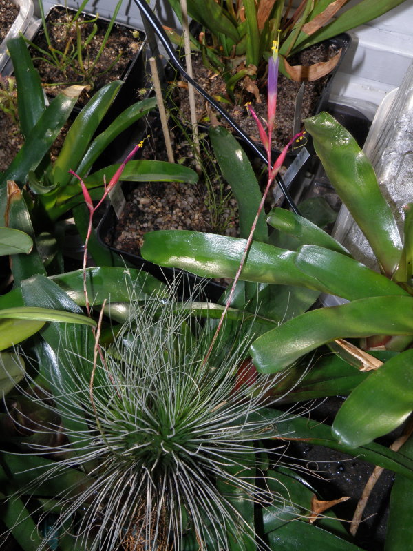 č.2 - Tillandsia fuchsii var.gracilis právě odkvétají obě dceřinné rostlinky, matečnice kvetla v květnu 2010, čili novým rostlinkám stačí k dospělosti necelé dva roky.