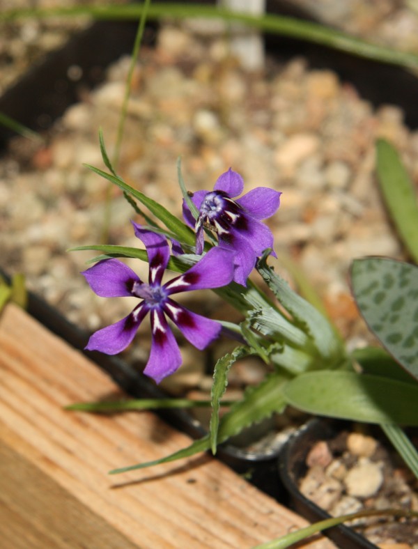 Na poslední kytku jsem hodně hrdý, i když je to vlastně náhodný úspěch. Je to Lapeirousia oreogena z čeledi kosatcovitých, taky z jižní Afriky. Tyhle kytky blbě rostou - semena vyklíčí, první rok to jde, ale druhým rokem nevyraší. Klidně mohou zůstat v klidu třeba deset let a dosud je otázkou, co je budí k vyrašení. U některých druhů jsou to zcela jistě podzimní požáry, co už není tak jisté, jestli je vybudí prudké zahřátí zásobních orgánů v půdě, nebo látky, které při tom hoření vznikají - někdy stačí zálivka výluhem z čerstvého popela. Tuhle kytičku jsem vyséval na podzim 2009, na podzim 2010 nevyrašila. Na podzim 2011 jsem se podíval do květináče a zjistil, že ze stovky semen je tam jediný oddenek, ten po přesazení vyrašil. No a letos kvete! Tak doufám, že to není "rozlučkové" kvetení. Kvítek má průměr asi 2 cm, horní je poněkud ožraný od slimáka.