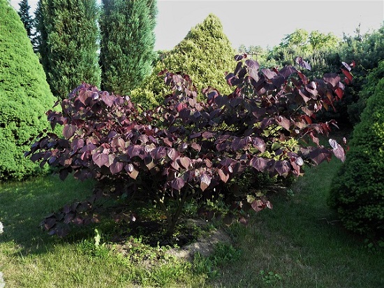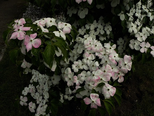 Takže ještě znovu zmarlika kanadská už olistěná forma Forest pansy, s krásnými zbarvenými listy, kde ostatní typy je mají zelené, svída japonská, kde květy začínají růžovět a na druhé jsou zřejmě dva rouby, protože teprve rozkvétá bíle a červeně a květy se postupně zvětšují.