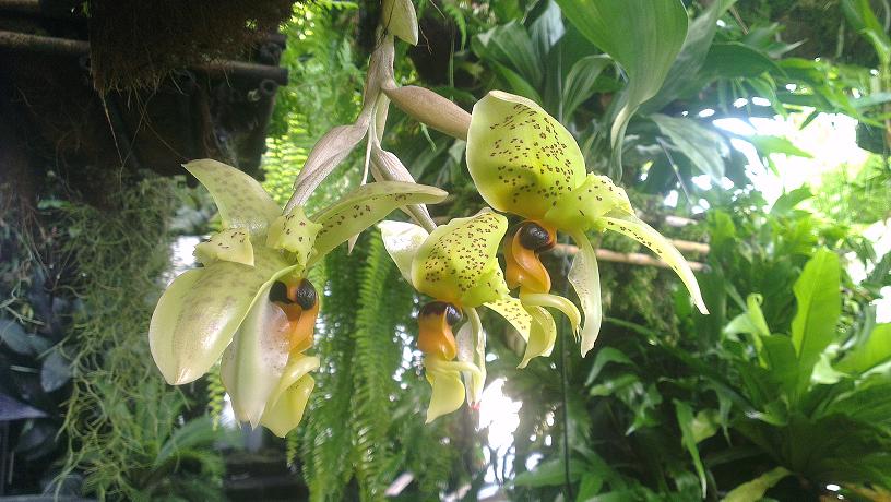 Stanhopea tigrina v plné parádě...............3 květenství najednou, celkem 6 květů , velkých jako dlaň. Těžko popsat jak to ve skleníku voní.