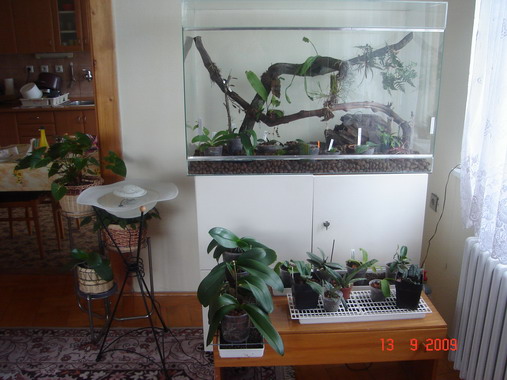 Tak mám nové místo na vitrínu, tam měla původně být,ale z toho světla jsem zase trochu mimo, prý ty zářivky musí být uvnitř , jinak přes sklo to nemá význam....Mám novou Ornitophoru radicans od p. Ježka