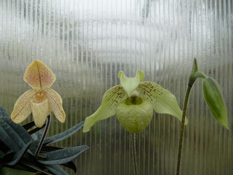 Rozkvetlo pár pafiopedil: Paph. concolor var. striatum a Paph. malipoense var. jackii.