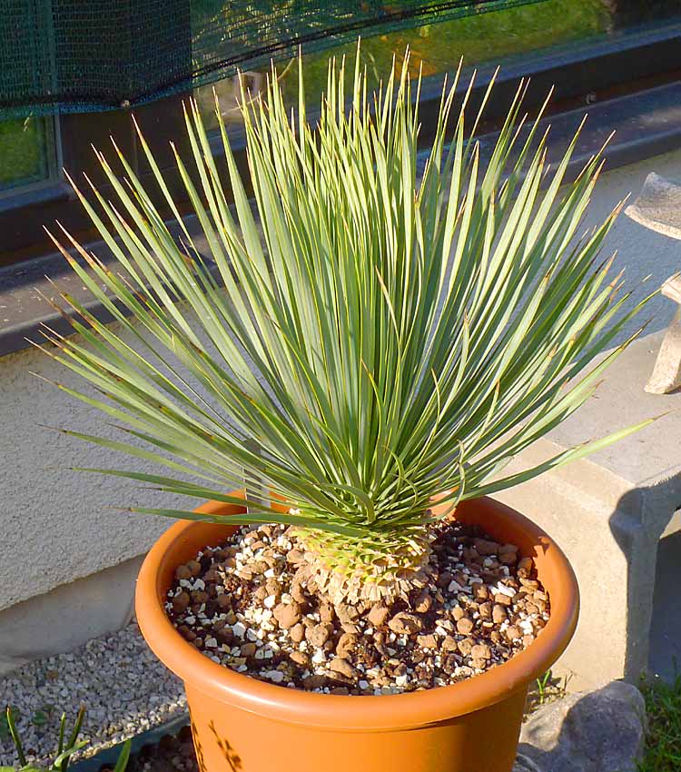 Tragedie je, že se mi postupně líbí kde co. A tak přes olivovníky, vánoční hvězdu, cykasy. palmy ap. jsem si pořídil nově Yucca rostrata a zakrslou višeň jako bonsai. Yucca je krásně modrošedá a v květináči by měla vydržet alespoň -5°C jako olivovníky. Ty již raší a nasazují na květ. Letos jsem je měl skoro celou zimu venku.