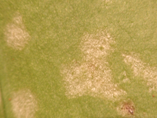Posílám problém, který se vyskytl na listech. 1. phalaenopsis, 2. cymbídium. Oboje na spodní straně, jen u cymba jeden obr. vrchní.