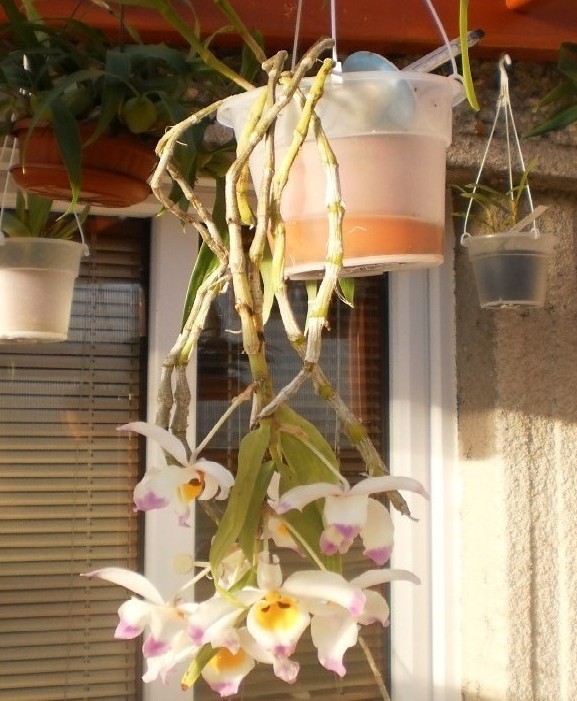 Ještě jedno přeji dobrý večer a ráda bych sem dala pár foteček takové mojí dendrobii Adély.Dendrobium wardianum paří do skupiny temperovaných a opadavích dendrobii, kvete z internodii jako D. nobile. K indukci kvetení také potřebuje pauzu se snížením teploty a omezením zálivky, ale ne nijak závratnou. Nyní se mi opět nalévají internodia a přitom rostlina stále narůstá - proto ta Adéla :lol: . No snad to nebudou keiky 8-), málem bych zapoměla dodat, že květy jsou poměrně trvanlivé kvetla cca 6 týdnů a voní příjemnou květinovou vůní na sluníčku. Naposledy kvetla na podzim a k indukci došlo díky chladným dnům v srpnu pár základů poupat sice zaschlo, když se nenadále oteplilo, ale co se dá dělat nemusí pršet stačí když kape. :)