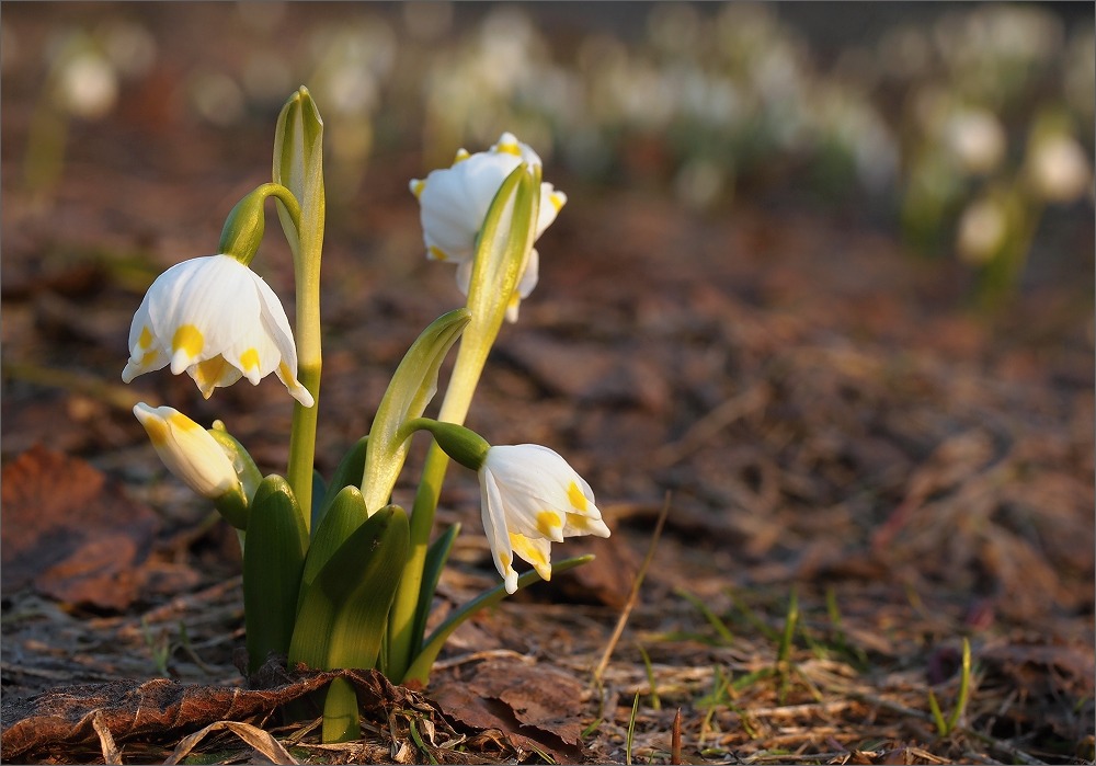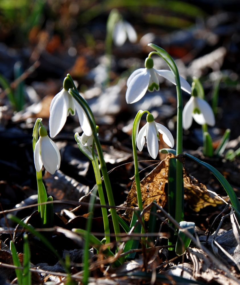 Ještě jedna bledule-zcela netypicky otevřený květ- a klubající se sněženky...